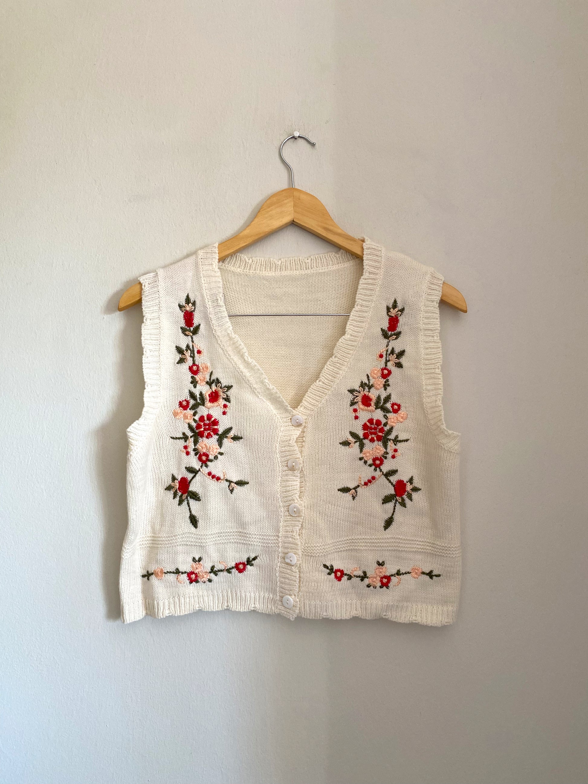 This cream knit button-up vest with floral embroidery is the sweetest piece for spring. Wear it over a crisp shirt, a flowy dress, or on its own for effortless cottagecore vibe