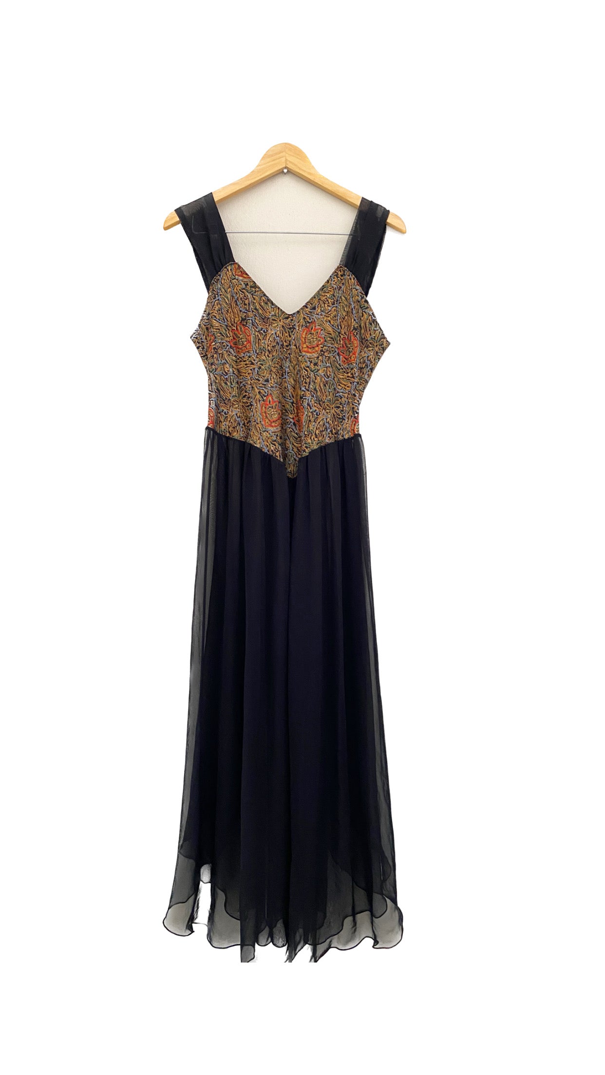A tapestry-style embroidered bodice, soft sheer straps and a cascading chiffon skirt that moves like smoke. Perfect for slow dinners, candlelit nights, and moments that deserve a little drama.