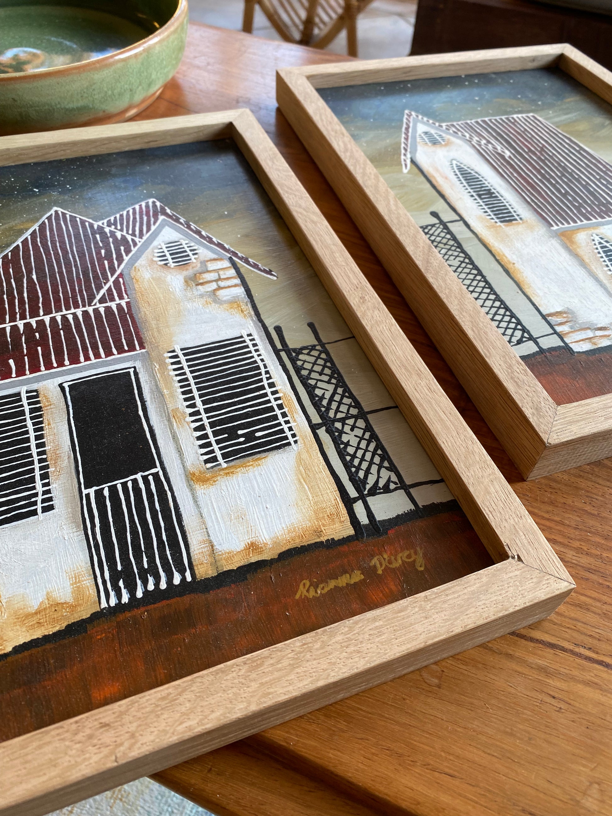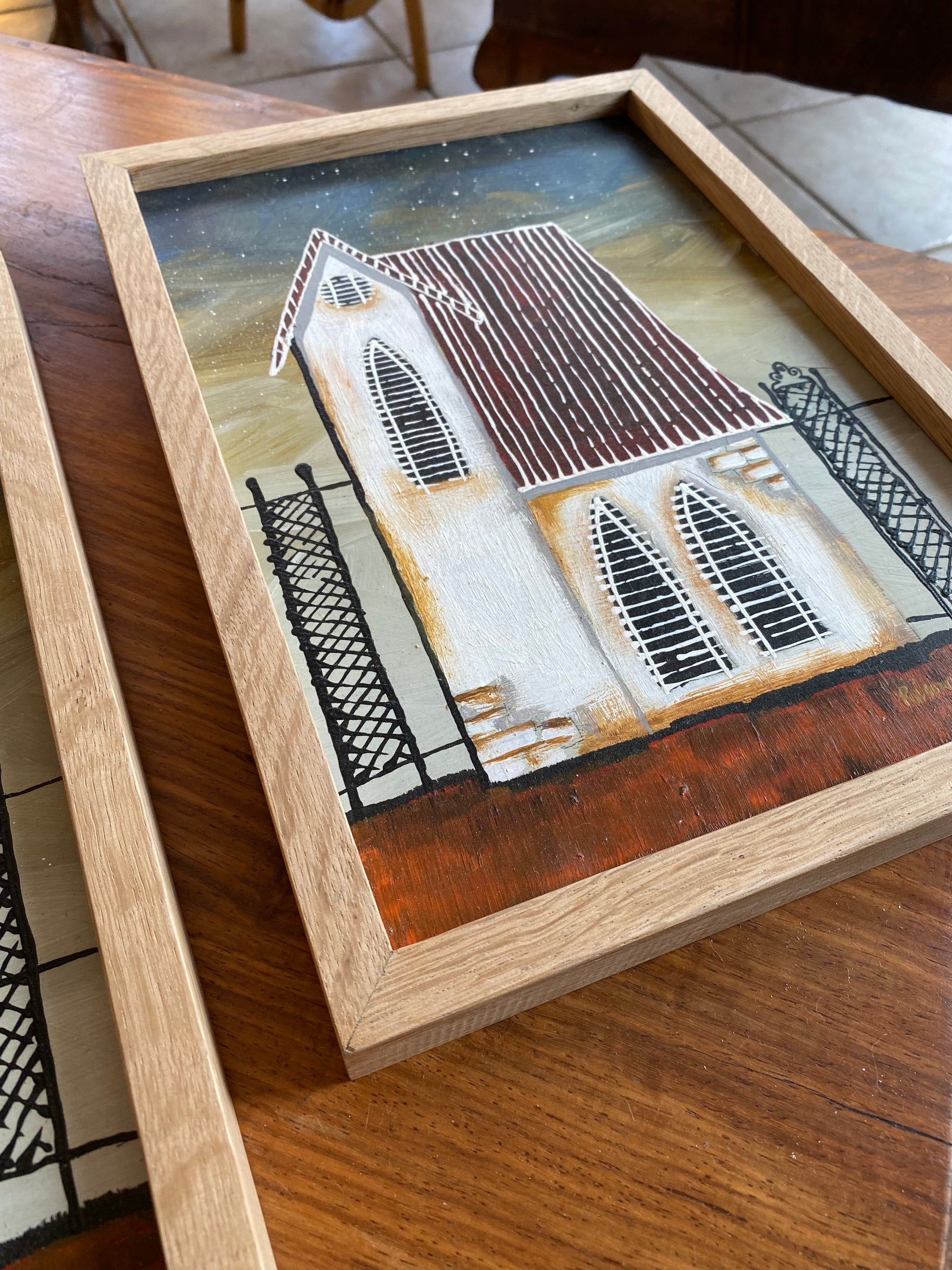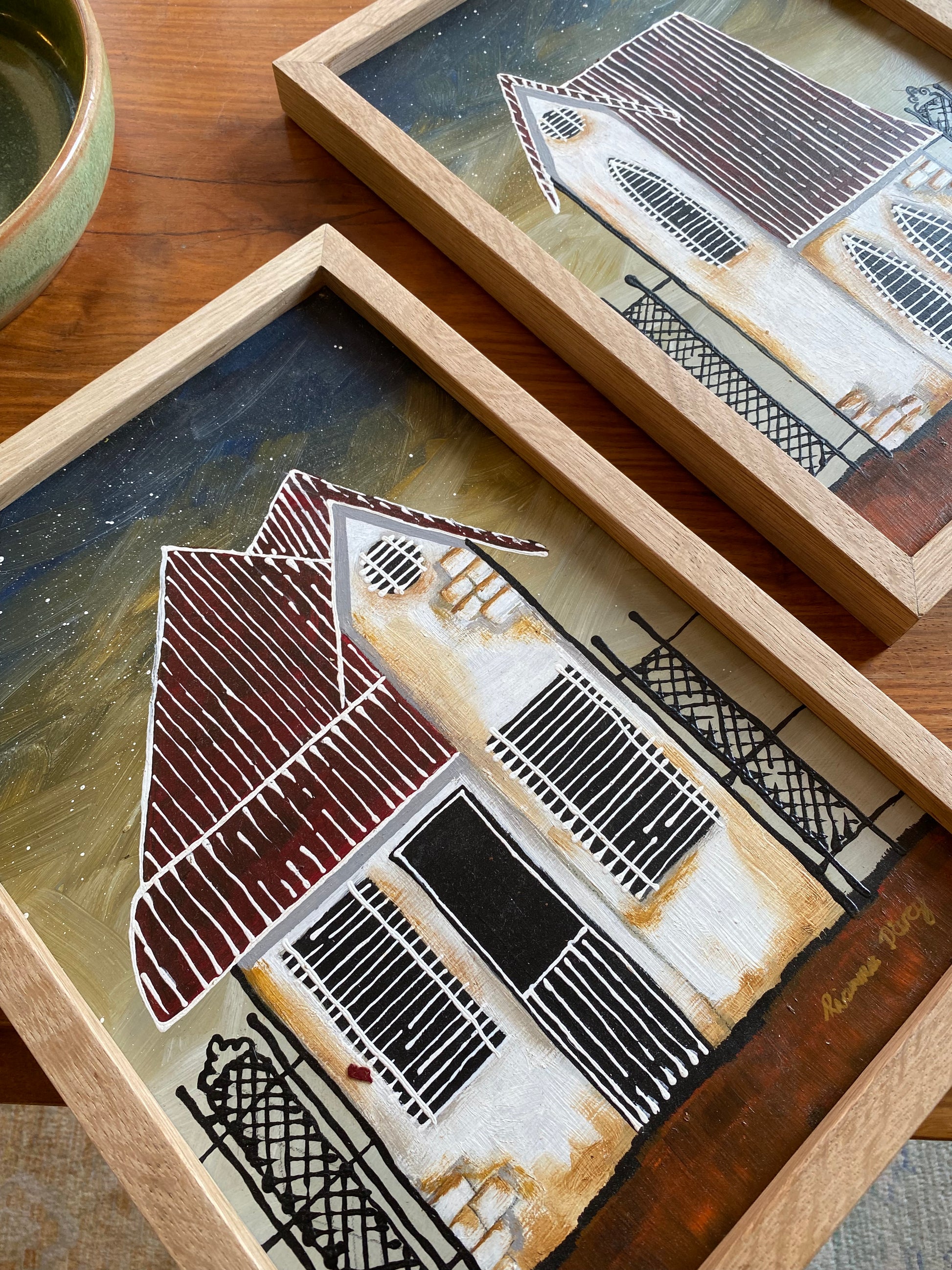 ⭐️These original pieces are the perfect blend of mid-century charm and moody folk art. They feel like they belong in a fairytale—the wrought iron fences, the glowing white facades, and that deep, layered night sky.⭐️