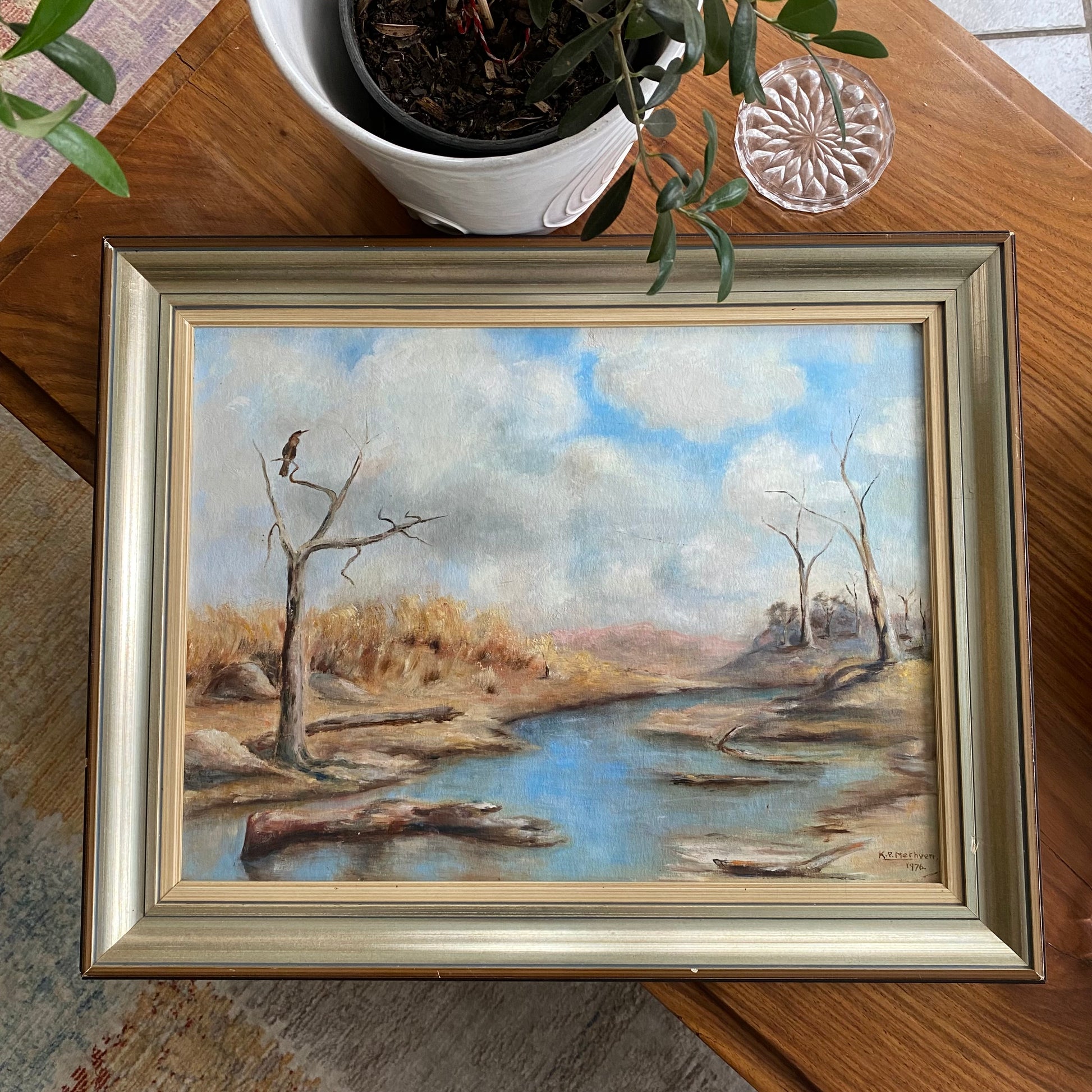 There’s something timeless about painted skies — the way they hold stillness, the way they whisper of seasons long past. This 1976 landscape brings that same calm into any corner of your home.🌿